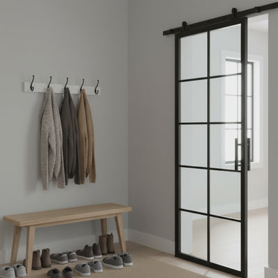 The Alpada 10 Lite Interior Steel Barn Door features a tall, symmetrical grid with ten evenly sized glass panels divided by slim steel lines. The design evokes the look of classic steel windows, offering both openness and structure—perfect for interiors that blend industrial charm with modern elegance.