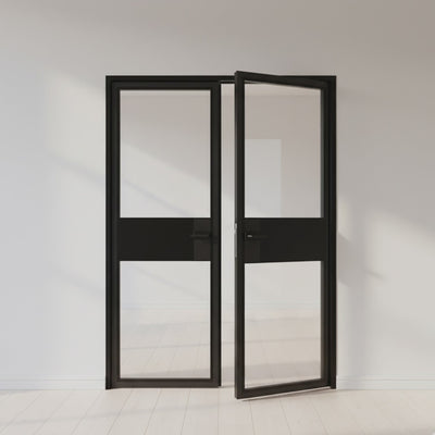 Both door slabs are made from single panes of tempered glass, visually segmented by the midline and slim steel framing for a streamlined, contemporary look. This design allows light to pass freely while providing structure and partial privacy—ideal for shared spaces or open transitions.