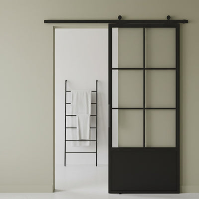 The Alpada 6 Lite Interior Barn Door with Steel Panel features a bold and refined design with six glass panels arranged in a modern grid above a solid steel panel at the base. Slim steel lines create a rhythmic layout, while the lower panel adds visual weight and privacy—offering a balanced mix of light flow and grounded structure.