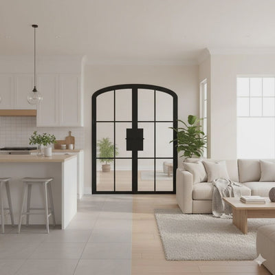 Crafted from powder-coated carbon steel and tempered glass, this arched double door brings structure and style to transitional areas, dining rooms, and open interiors that call for elegance, symmetry, and light-filled design.