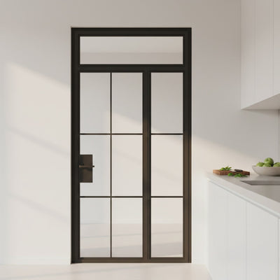 The Alpada Interior Steel Glass Door – Transom & Right Sidelite from the Classic Grid Collection introduces harmonious asymmetry through a high transom and a right-side sidelite. Together they frame the opening with balanced transparency and graceful proportion.